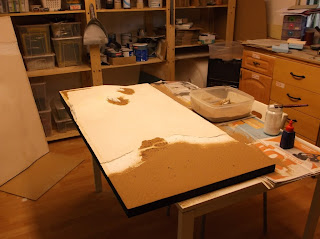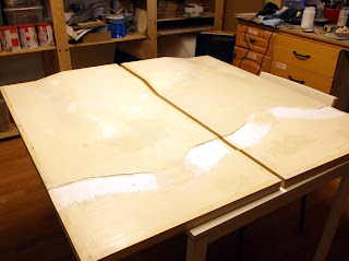 The features are then given a nice plaster overcoat that is approx 3mm thick, the main points to check are the board alignments. In the case of these boards its the river and lower faces of the hills. So after another 4 hours again we have to take a break overnight for the plaster to dry out.