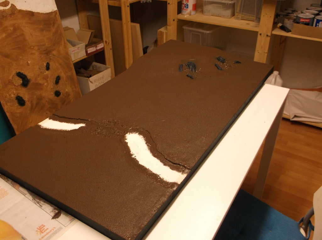 So thats the boards textured, you will notice the river is texture free, that comes later and the white patches on the slopes are rock features. This all needs a good few hours to dry so I normally leave this overnight.